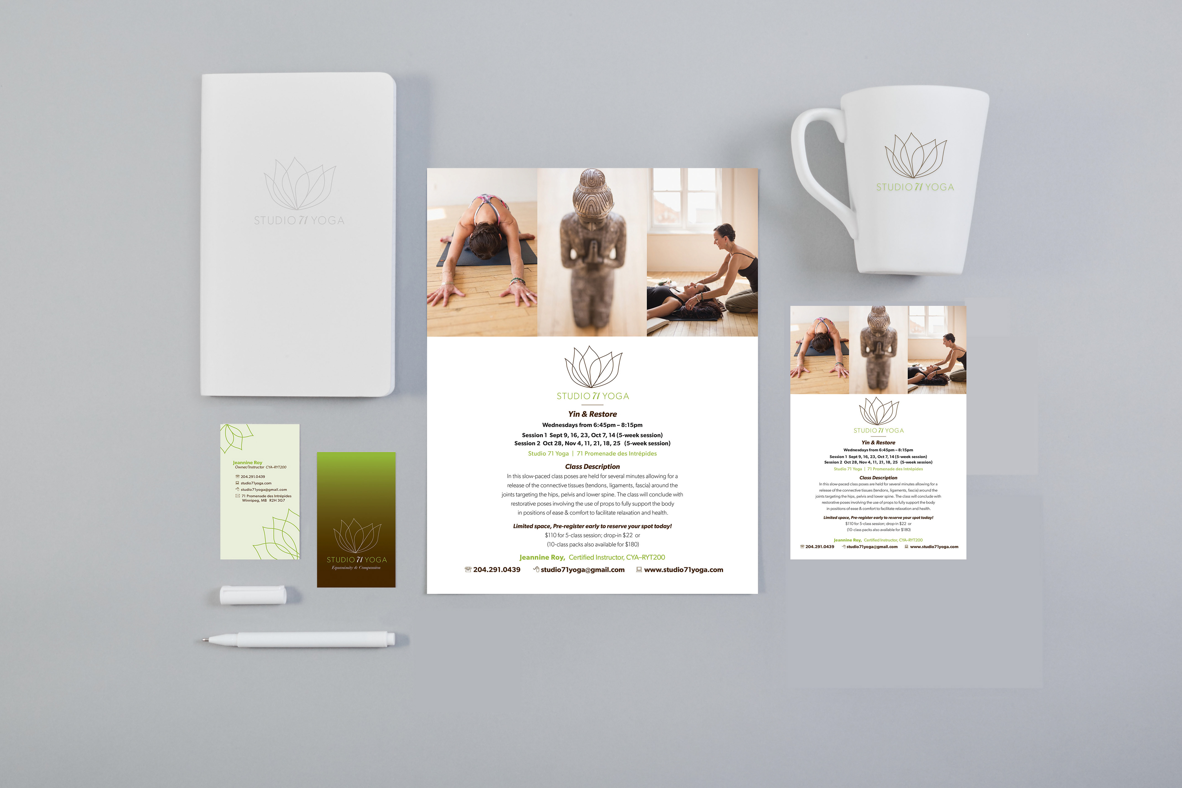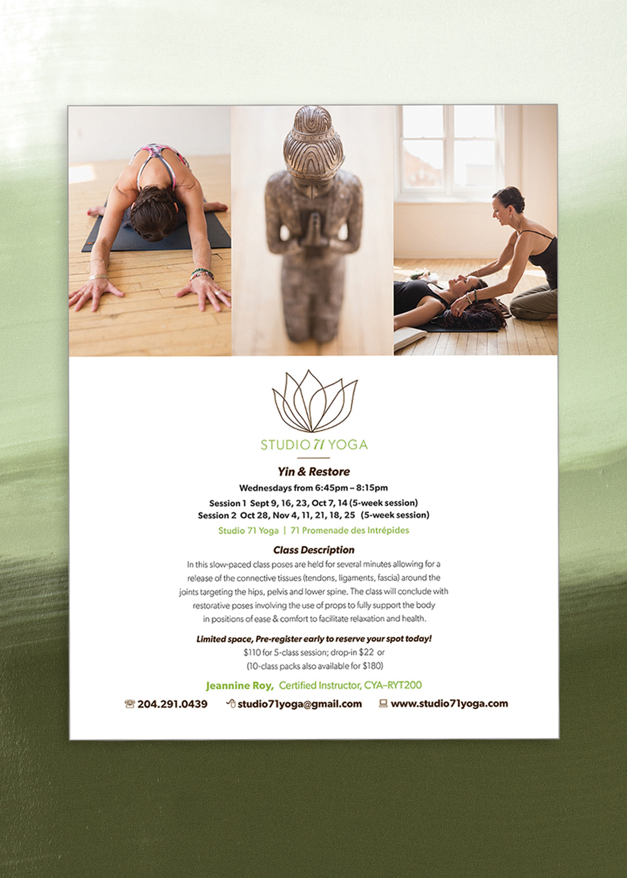 SOLUTION The result is a cohesive brand identity. The logo is a lotus and the lotus is a symbol of transformation. The poster's and postcard's helped to inform existing and new clients of the class session's offered throughout the season. The photoshoot allowed for a variety of photos for print and digital marketing.